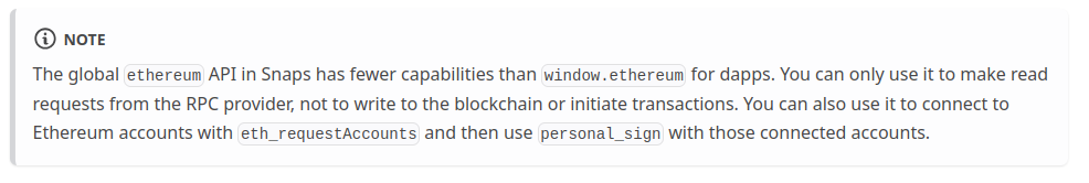 On the other hand, the ethereum provider only blocks methods starting with snap_ and the blocked methods. However, it requires the endowment:ethereum-provider permission in the snap manifest.